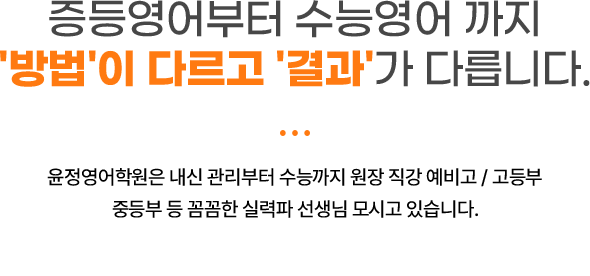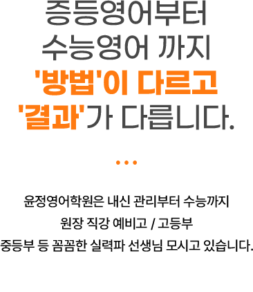 윤정영어학원에는 인근 고등학교 내신 1등급 2등급, 전교 1등-5등 사이 학생들이 상당수 공부하고 있습니다.